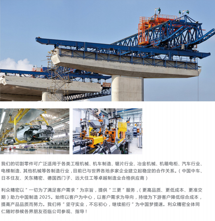 唐山市利眾精密制造有限公司創(chuàng)立于2007年4月,注冊(cè)資本金2000萬元,是佳源集團(tuán)的直屬分支機(jī)構(gòu),專注于鋼材、有色金屬等板材的切割、成型及焊接加工。公司采用的科學(xué)計(jì)算機(jī)套料系統(tǒng)和計(jì)算機(jī)報(bào)價(jià)系統(tǒng),有效的提高了切割件的成材率和報(bào)價(jià)的透明度。利眾精密憑借數(shù)控切割設(shè)備和豐富的加工生產(chǎn)經(jīng)驗(yàn),以合理出廠價(jià)格為基礎(chǔ),在保證產(chǎn)品質(zhì)量、交貨期及優(yōu)質(zhì)售后服務(wù)的前提下,為客戶提供全面的鋼材深加工服務(wù)。